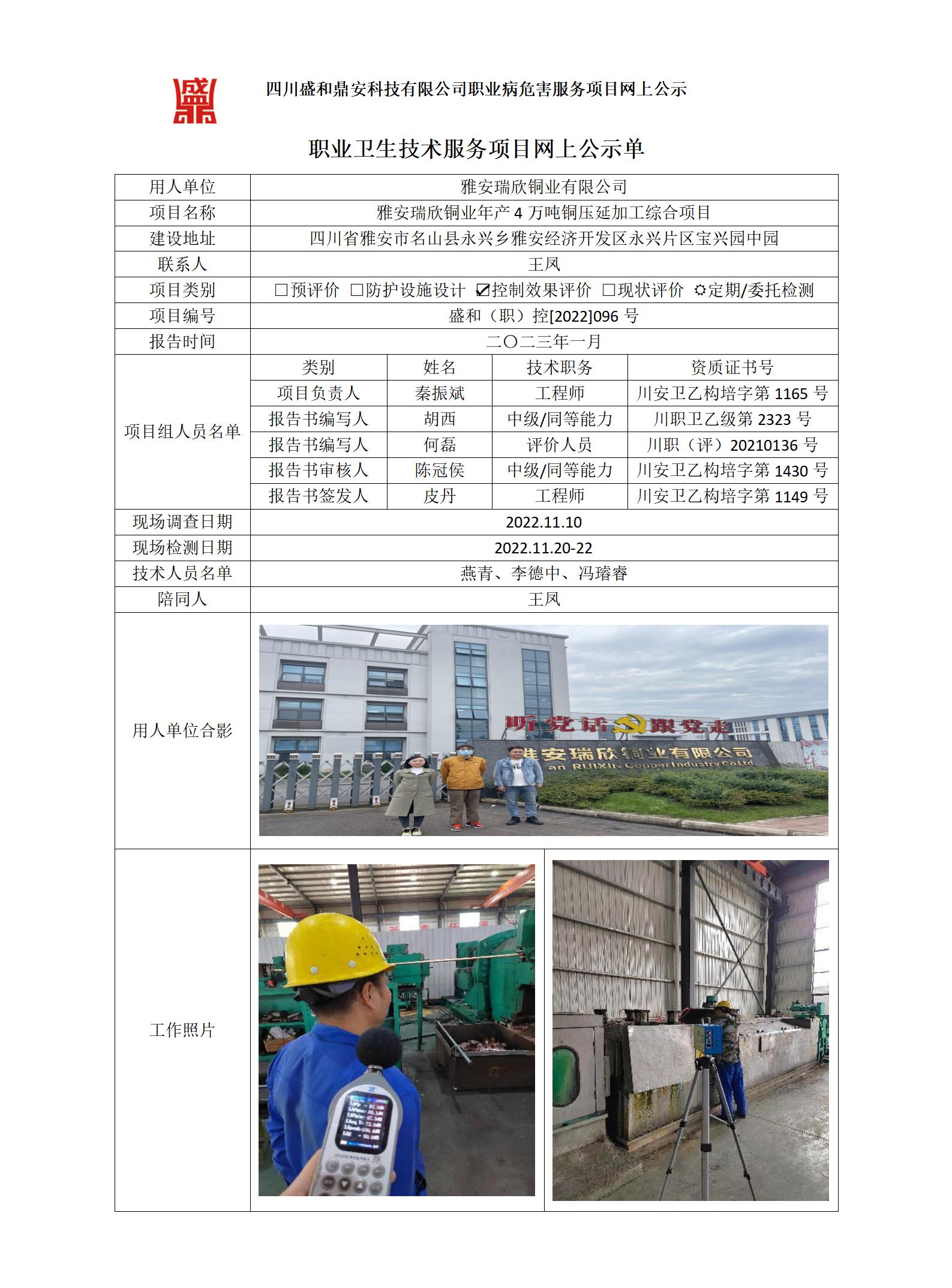 雅安瑞欣铜业有限公司雅安瑞欣铜业年产4万吨铜压延加工综合项目职业病危害控制效果评价