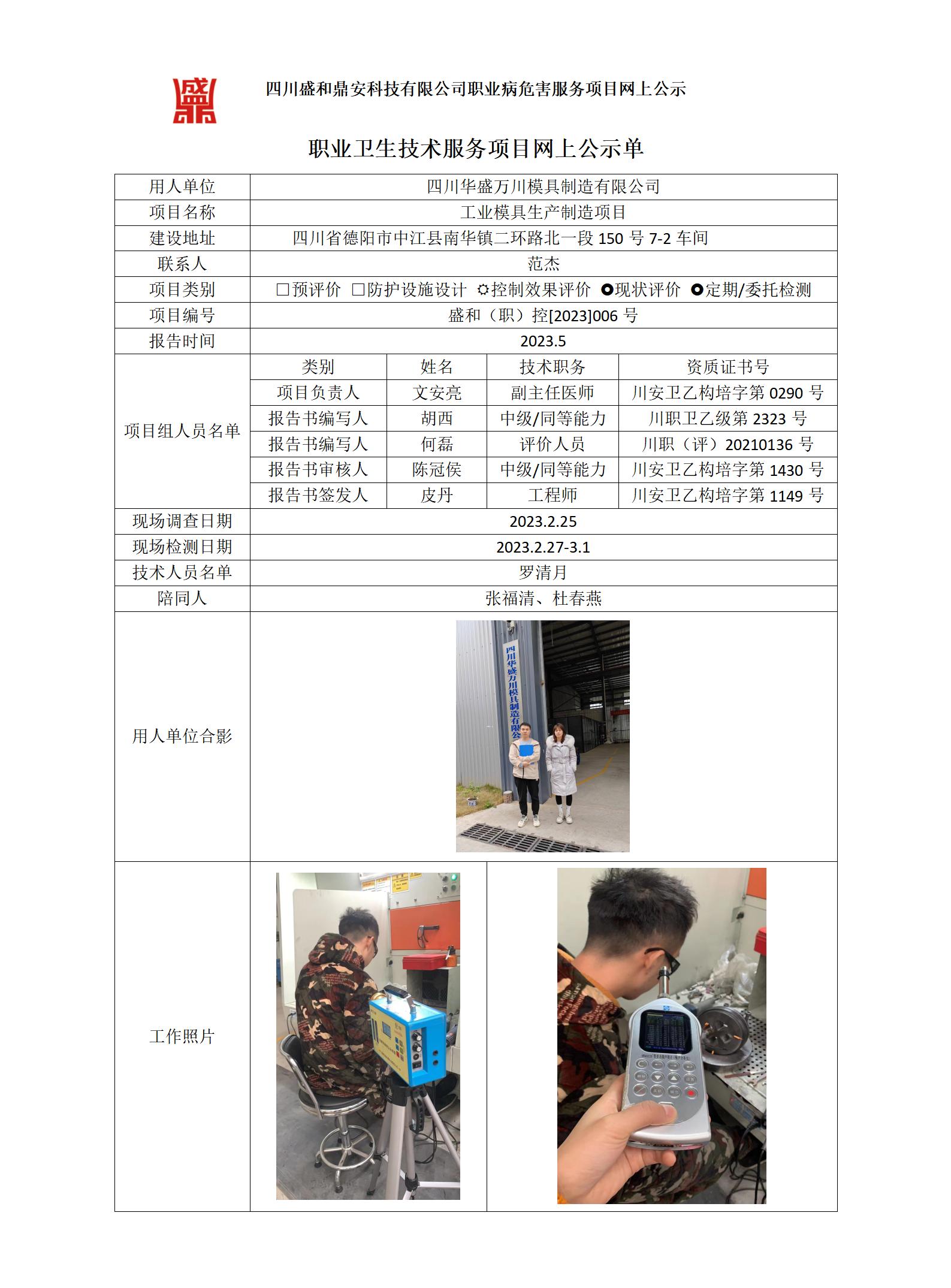 四川华盛万川模具制造有限公司工业模具生产制造项目职业病危害控制效果评价